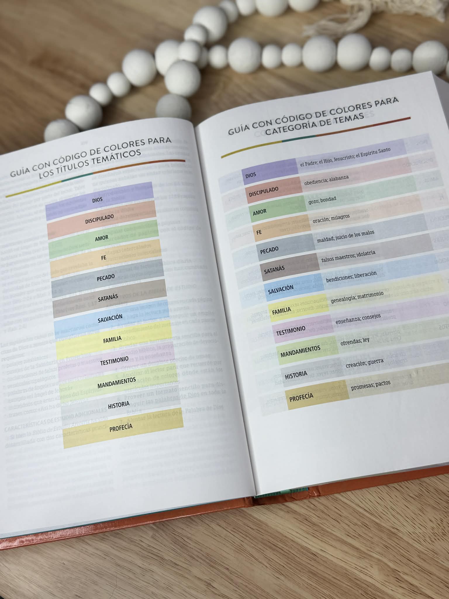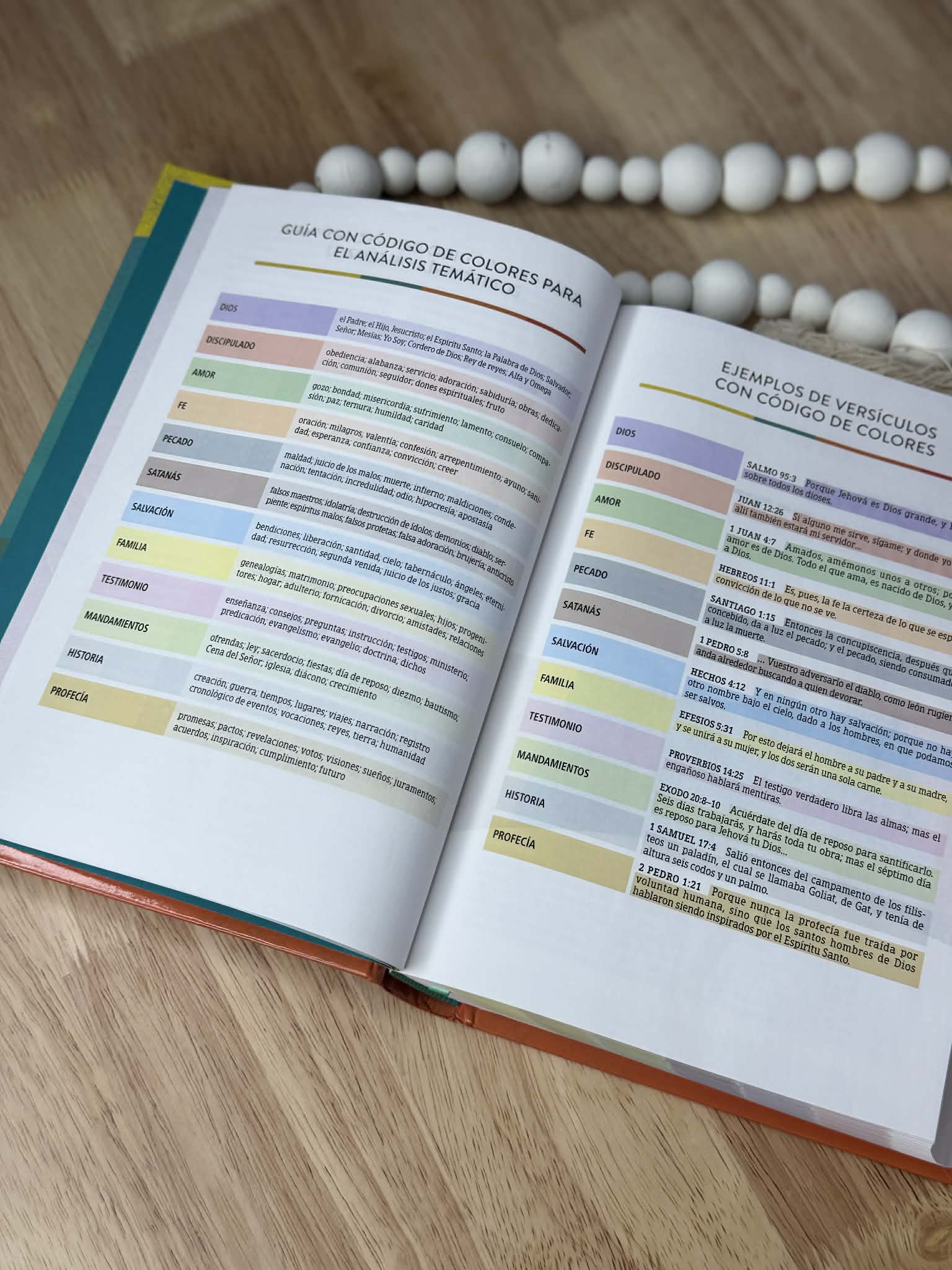La Biblia de Estudio Arcoíris Reina Valera 1960 cuenta con un sistema único de «código de colores» que le permite al lector de manera fácil y rápida identificar 12 temas importantes en la Escritura: Dios, amor, discipulado, fe, pecado, Satanás, salvación, familia, testimonio, mandamientos, historia y profecía.