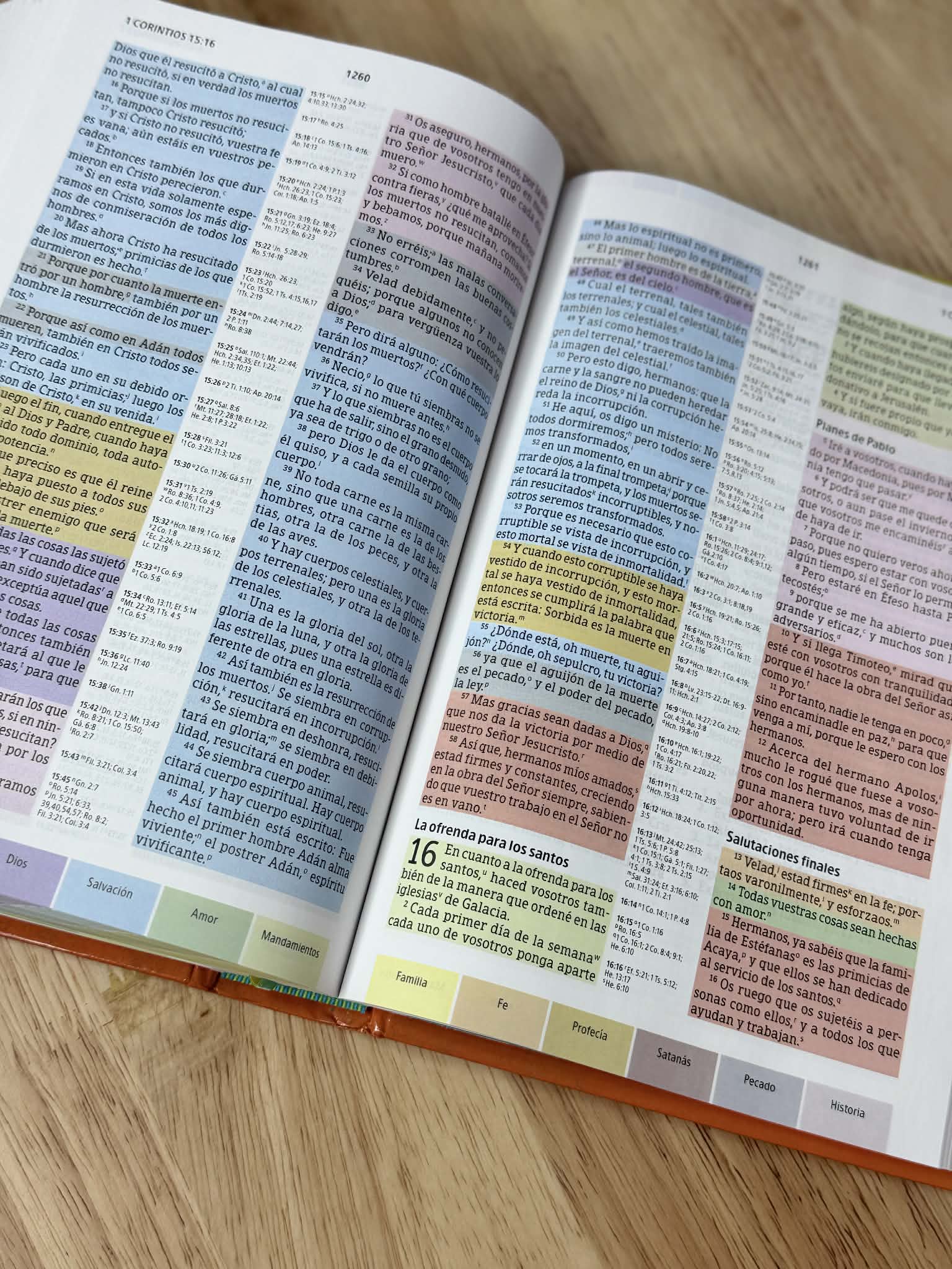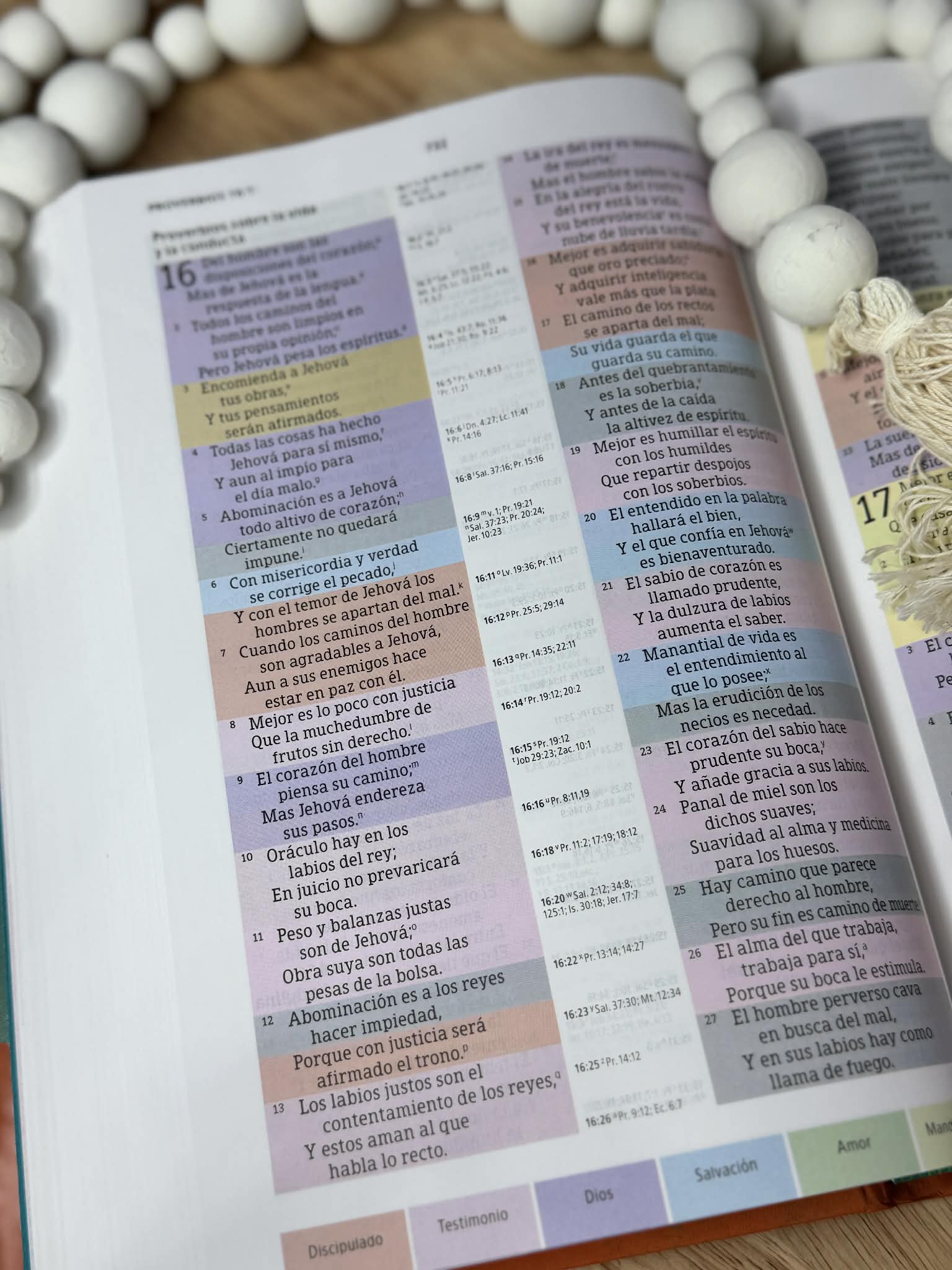• Cada versículo en su propio color de acuerdo con 12 temas clave