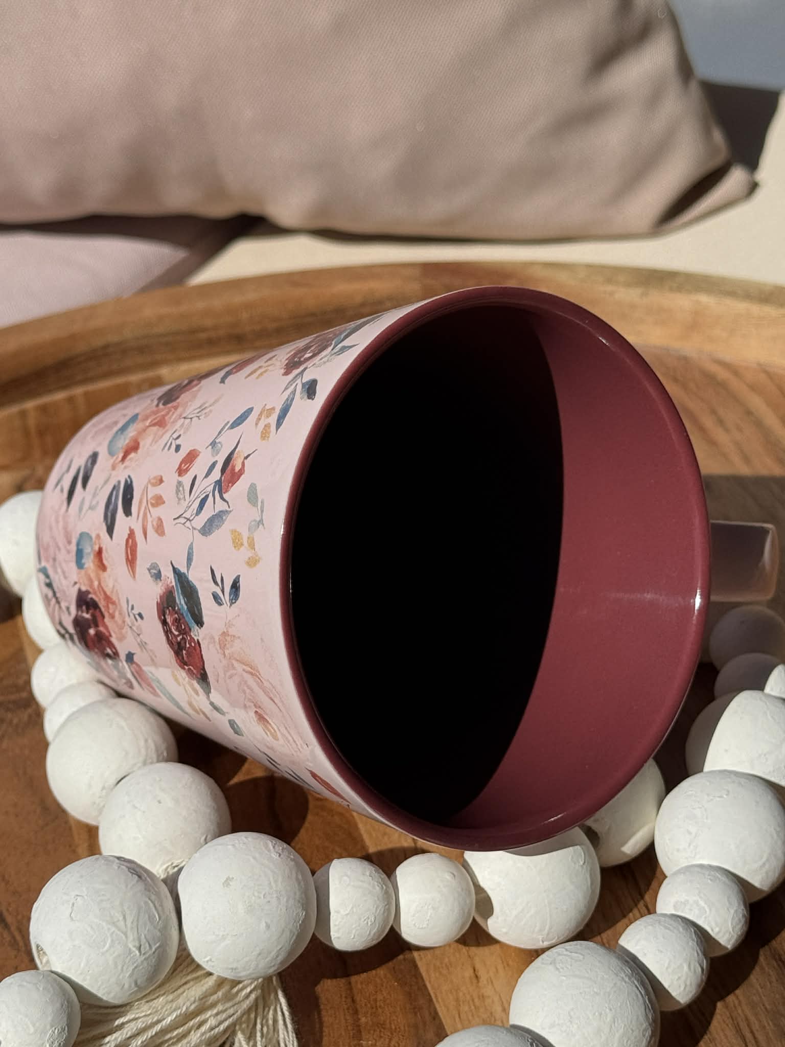 The glossy plum-colored interior ties in with the floral design on the mug's exterior and offer a delightful contrast. This ceramic mug is on the shorter side but can hold 14 fluid ounces of any beverage.