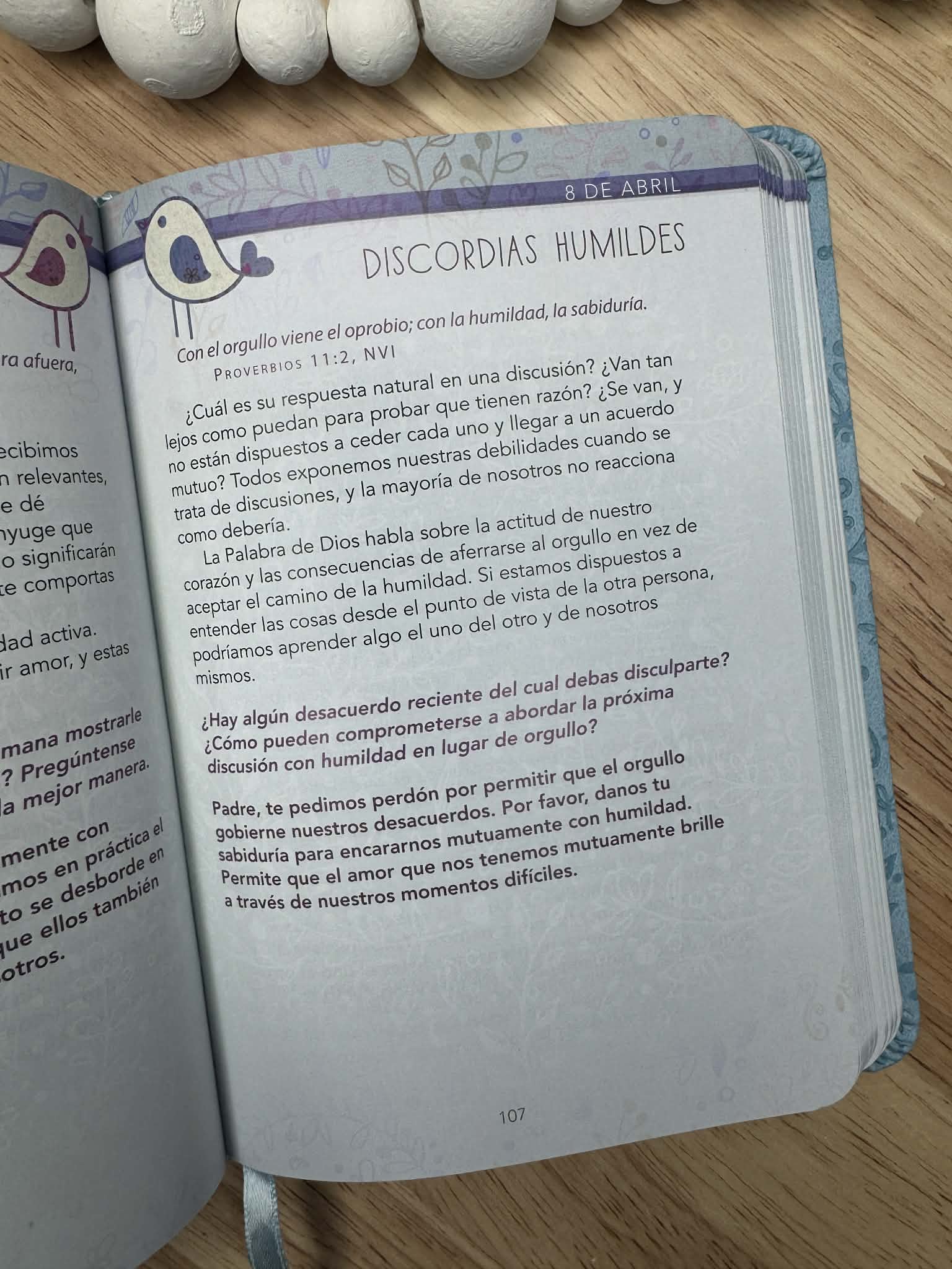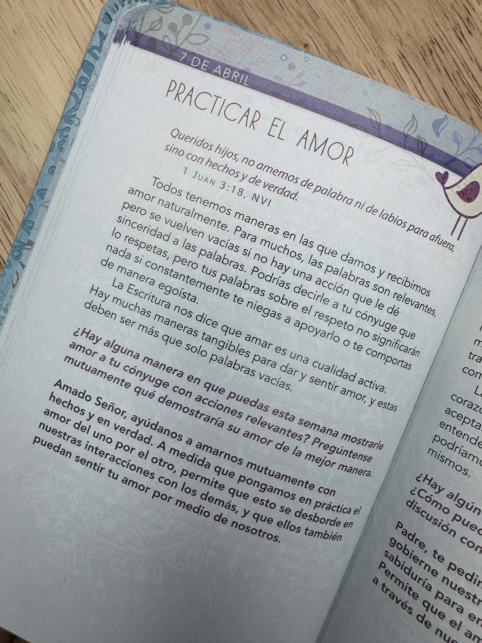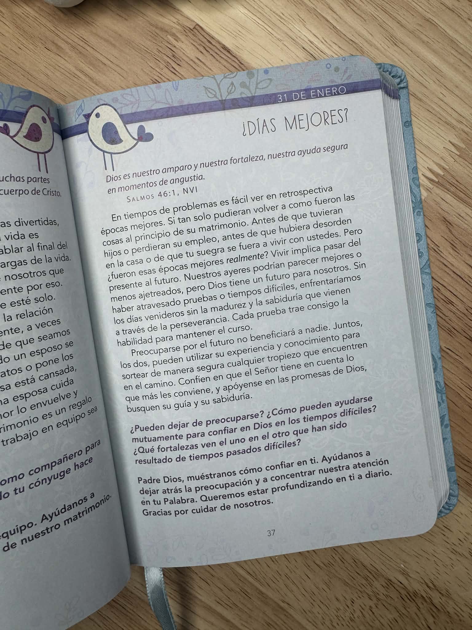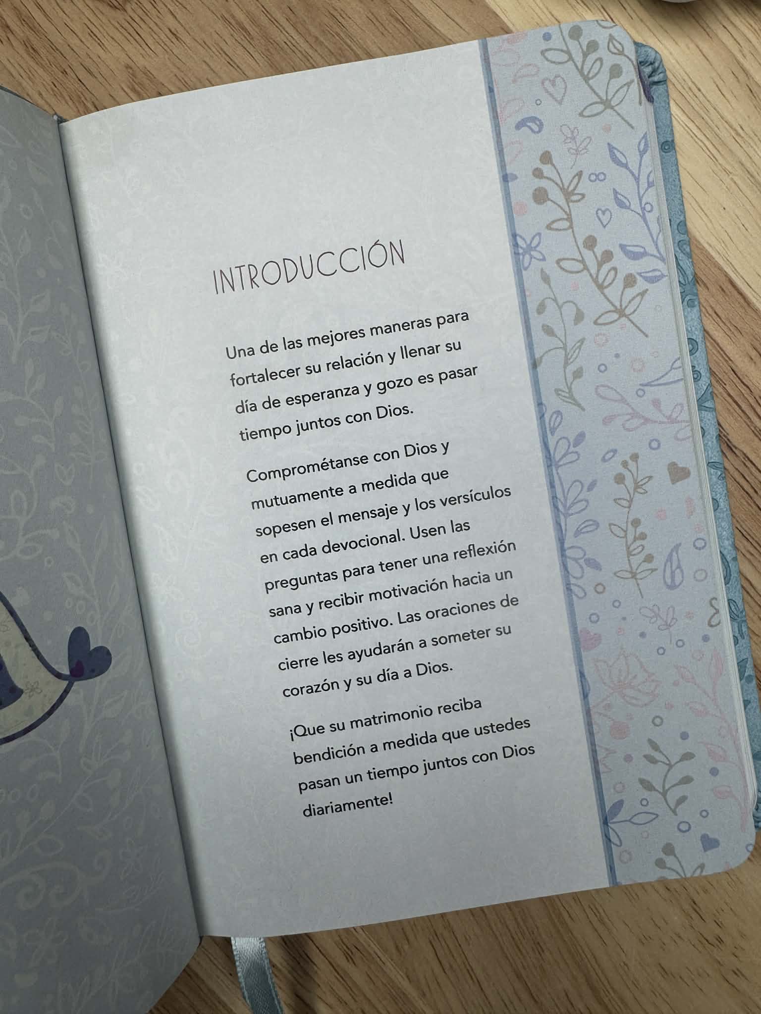 Pasar tiempo de calidad juntos como pareja puede ser difícil, ¡pero es increíblemente importante para mantener un matrimonio saludable! Una de las mejores formas de fortalecer su relación de pareja es pasar tiempo juntos con Dios. Este devocionario ofrece una nueva perspectiva sobre las relaciones, con textos bíblicos alentadores y preguntas que invitan a la reflexión; además, ofrece oraciones inspiradoras para ayudar a los cónyuges a participar intencionalmente con Dios y con los demás. Ya sea que hayan estado casados durante cinco días, cinco años o toda la vida, pasar un poco de tiempo con Dios es la mejor manera de comenzar o terminar el día juntos.