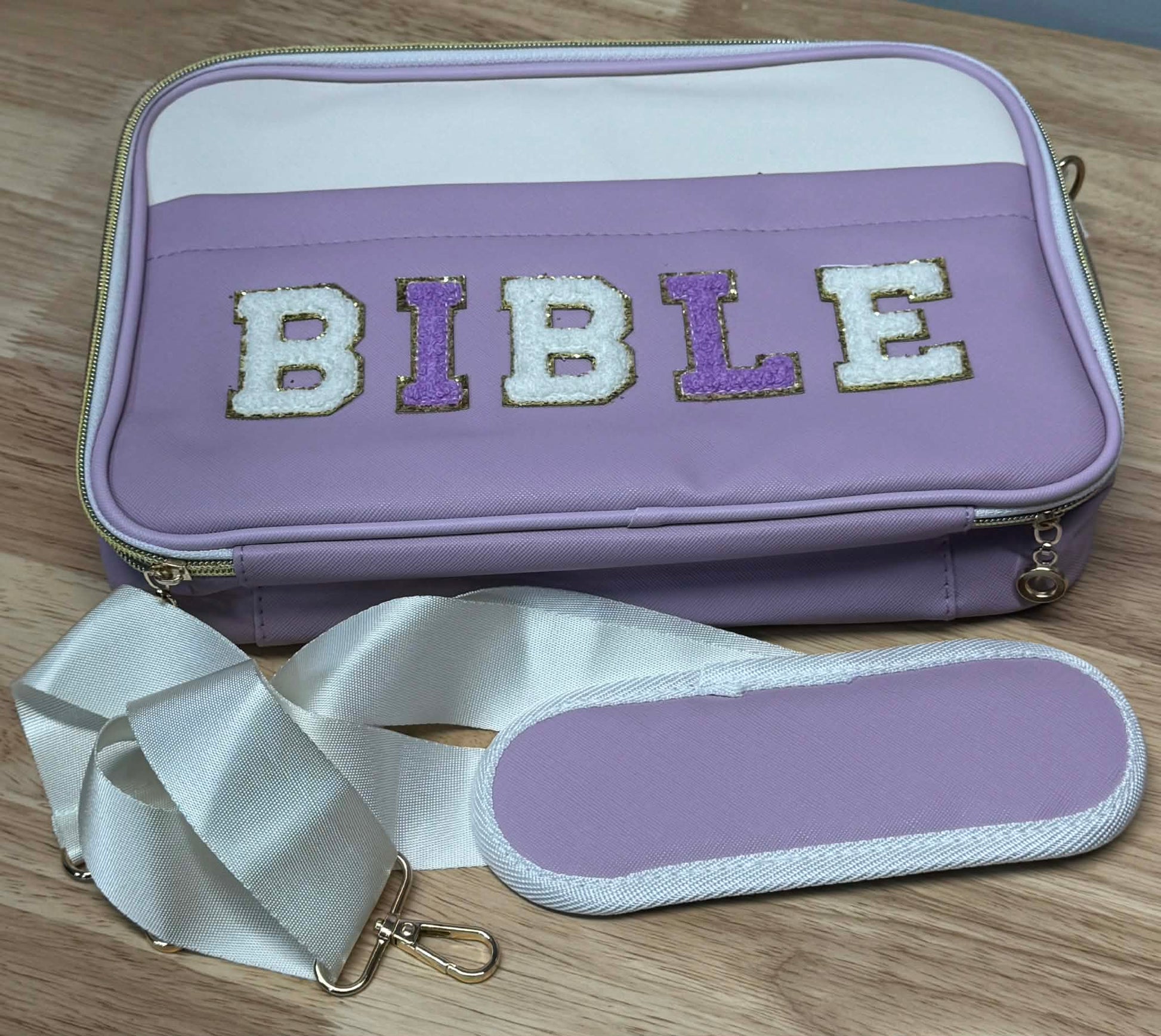 This beautiful Large Lavender Bible Case for Women with Preppy Chenille "Bible" Lettering, Detachable Shoulder Strap Zipper Closure - Stylish Christian Gift for Girls and Women, Measure 11x7.5x1.5 up to 2 inches ( filled )