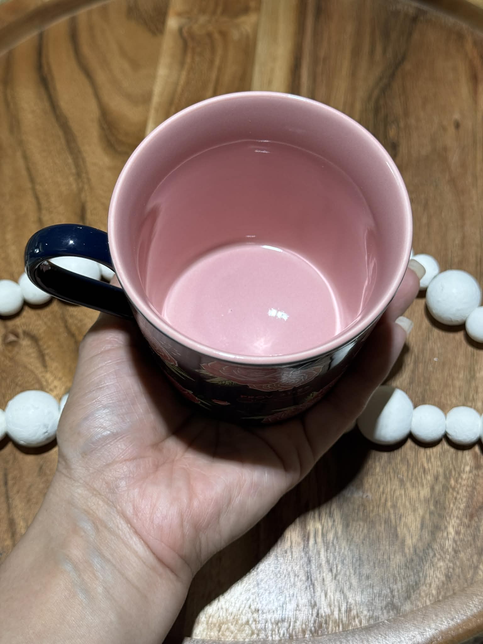 The mug's pale salmon-pink interior forms a striking contrast to the dark exterior, perfectly complementing the pink roses design. With a generous capacity of 12 fluid ounces, this mug accommodates your drink of choice, be it coffee, tea, or any other favorite beverage. The handle provides a comfortable grip for two fingers, and its size is ideal for use with personal coffee brewing systems.