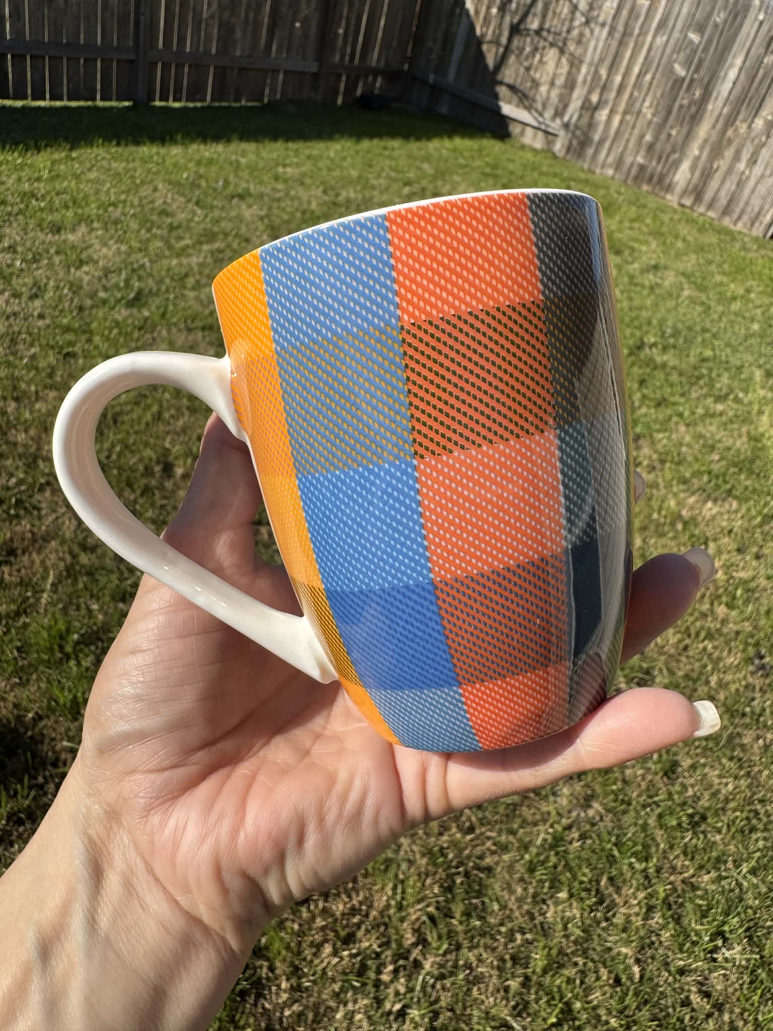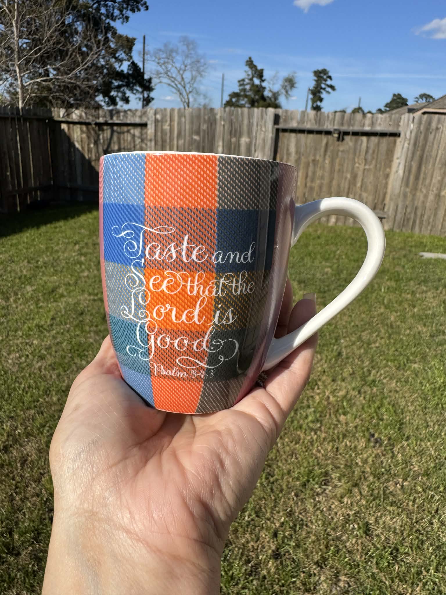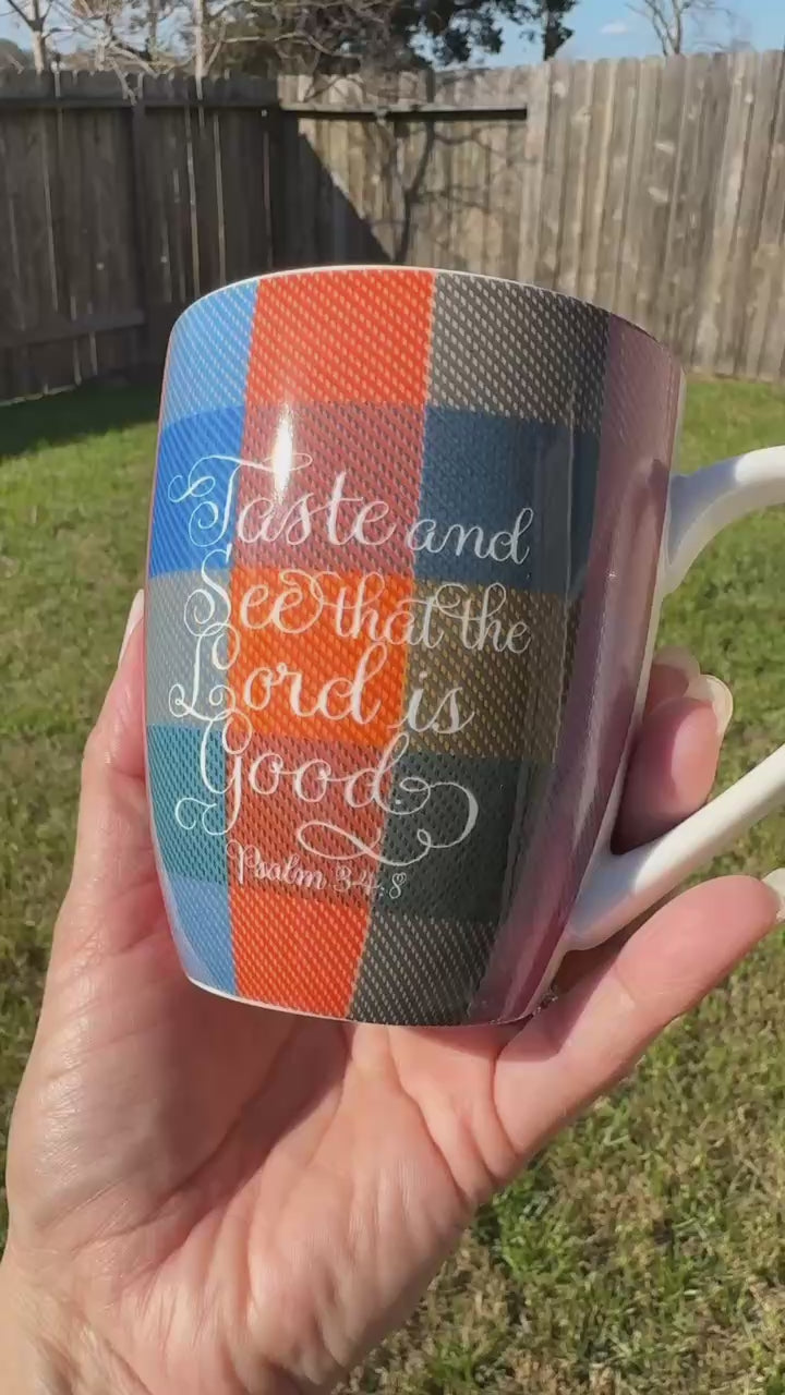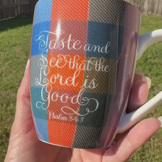 Bible verse printed on mug: taste and see, checked 10 oz mug Psalm 34:8