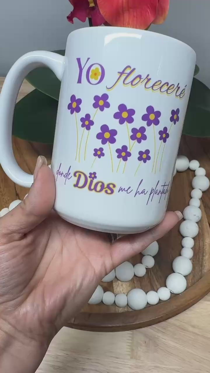 Yo floreceré donde Dios me ha plantado, Taza 15 oz Morada